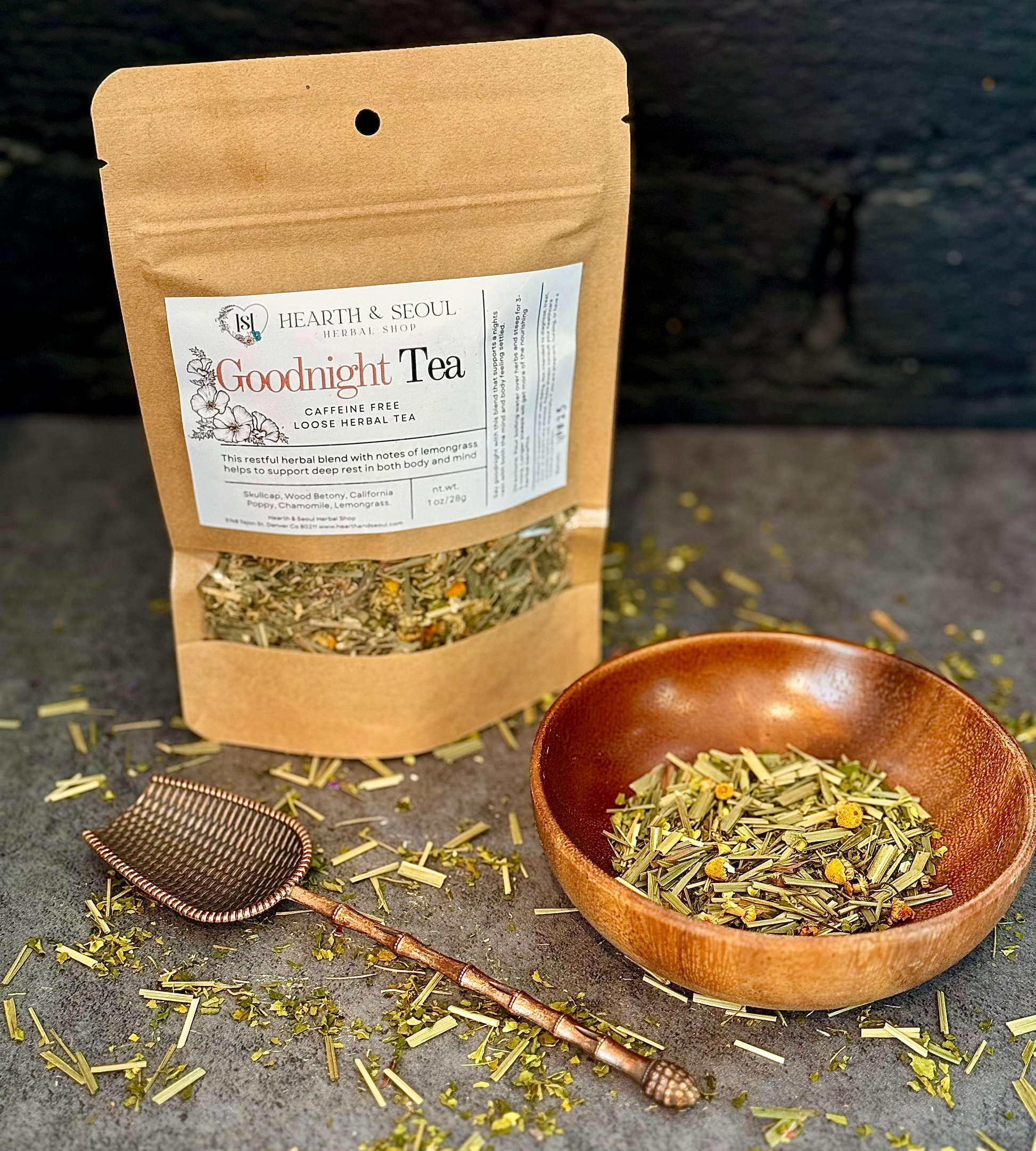 Unwind with our Goodnight Tea, a soothing blend thoughtfully crafted to help you relax, find calm, and support restful sleep. Featuring the gentle citrusy notes of lemongrass, this tea is a comforting companion for your evening ritual. Skullcap and wood betony promote relaxation, while California poppy helps ease muscle tension and chamomile provide a sense of peace to ease you into dreamland.